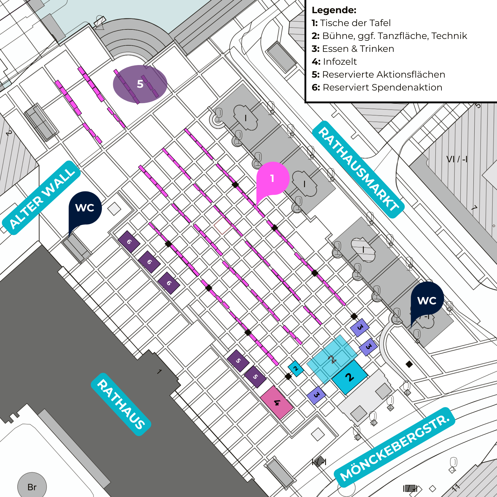 Wir streben wie im letzten Jahr an, allen beteiligten Akteuren den kostenfreien Zugang zu den Toiletten der Rathauspassage oder ähnlichen Orten zu ermöglichen. Dafür ist ein Tafel-Ausweis nötig, den Sie auf Nachfrage am Info-Zelt erhalten.