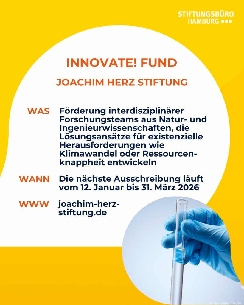 Die Joachim Herz Stiftung fördert mit dem innovate! fund interdisziplinäre Forschungsteams, die anwendungsorientierte Lösungen für dringende gesellschaftliche Herausforderungen entwickeln — etwa im Bereich Klima, Ressourcen oder nachhaltiger Materialien. Ob Natur‑ oder Ingenieurwissenschaften: Wer mit innovativen Ideen und gemeinsam mit anderen Fachrichtungen arbeitet, kann eine Förderung beantragen.