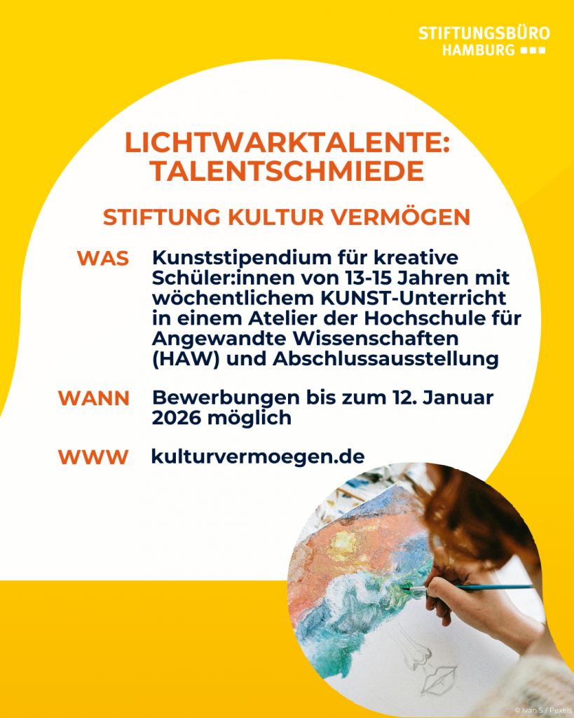Die Stiftung KulturVermögen eröffnet mit ihrem Projekt LichtwarkTalente jungen Menschen neue Wege zu kreativer Entfaltung und kultureller Teilhabe – ganz unabhängig von Herkunft oder sozialer Situation. Mit Programmen wie der Talentschmiede und dem Frühstudium fördert sie Jugendliche, die ein besonderes Talent in bildender Kunst mitbringen.