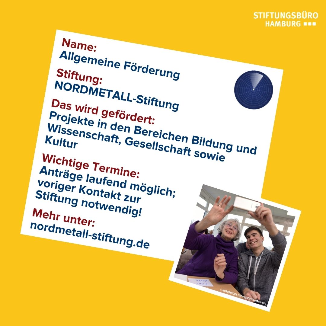 Die Nordmetall Stiftung ist eine operativ-fördernde Stiftung, deren Motto „Talente fördern, Zusammenhalt stärken, den Norden bereichern“ lautet. Die Fördergebiete erstrecken sich von Schleswig-Holstein und Mecklenburg-Vorpommern über Hamburg bis nach Bremen und Nordwest-Niedersachsen. Bei der Förderung von Projekten sind der Nordmetall Stiftung drei Kriterien wichtig: Jedes Projekt sollte auf gesellschaftliche Herausforderungen im Fördergebiet reagieren, nachhaltig wirken sowie Aufwand und Kosten in ein angemessenes Verhältnis zur Wirksamkeit stellen. Die Förderschwerpunkte sind dabei thematisch sehr vielfältig. Einerseits werden Projekte aus dem Bereich Bildung und Wissenschaft gefördert – mit einem klaren Fokus auf der MINT-Bildung. Der Förderschwerpunkt „Gesellschaft“ zielt wiederum auf Projekte ab, die bürgerschaftliches Engagement und den Zusammenhalt der Gesellschaft stärken. Ein weiterer Schwerpunkt ist der Bereich Kultur. Die Stiftung möchte sich gemeinsam mit den Projektträger:innen für neue Formen der Kulturvermittlung einsetzen. Geeignete Projektideen müssen der Nordmetall Stiftung im persönlichen Gespräch erläutert werden, bevor ein Antrag gestellt werden kann. Über die Vergabe von Budgets beraten Vorstand und Kuratorium unregelmäßig zwei- bis dreimal jährlich. Weitere Infos zu den Förderkriterien und den Kontaktdaten gibt es hier.
