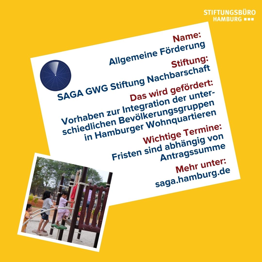 Die SAGA GWG Stiftung Nachbarschaft unterstützt Projekte, die stabile nachbarschaftliche Strukturen, den sozialen Ausgleich und die Integration der unterschiedlichen Bevölkerungsgruppen in den Hamburger Wohnquartieren fördern. In einem stiftungseigenen Projekt fördert sie sogenannte Quartierskünstler:innen mit einem Atelierstipendium. Seit mehr als 15 Jahren erhalten Künstler:innen in Hamburg dieses Stipendium, das einen Zuschuss zum Lebensunterhalt, die kostenfreie Nutzung eines Ateliers sowie künstlerische Produktionskosten umfasst. Für die Laufzeit von elf Monaten können die Stipendiat:innen so ihr Quartier kulturell beleben.