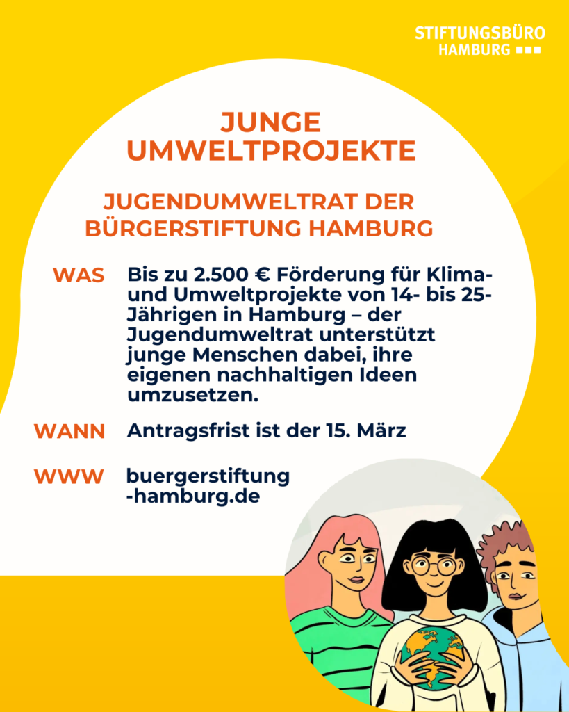 Die BürgerStiftung Hamburg fördert mit dem Jugendumweltrat junge Menschen zwischen 14 und 25 Jahren, die eigene Klima- und Umweltprojekte in Hamburg umsetzen möchten. Gefördert werden Ideen, die einen konkreten Beitrag zum Umweltschutz leisten und die Teilnehmenden aktiv einbinden.