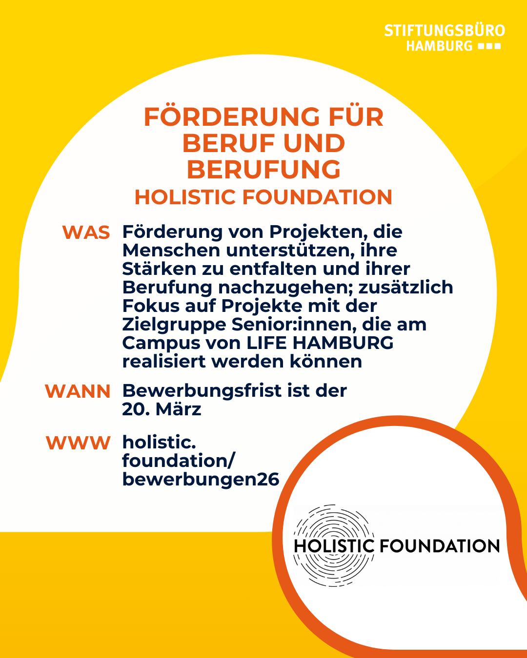 Die Holistic Foundation unterstützt im Förderzyklus 2026 Initiativen, die sich in den Förderschwerpunkten Lebenslanges Lernen/Bildung, Beruf/Berufung, Wohlbefinden/ Gesundheit und/oder Umwelt/Ernährung engagieren. Fokusthema des diesjährigen Zyklus ist das Thema Beruf/Berufung. Zudem möchte die Stiftung Initiativen unter den Bewerbungen priorisieren, die Senior:innen als Zielgruppe in den Blick nehmen und am LIFE HAMBURG Campus, dem größten Projekt der Stiftung, umsetzbar sind.