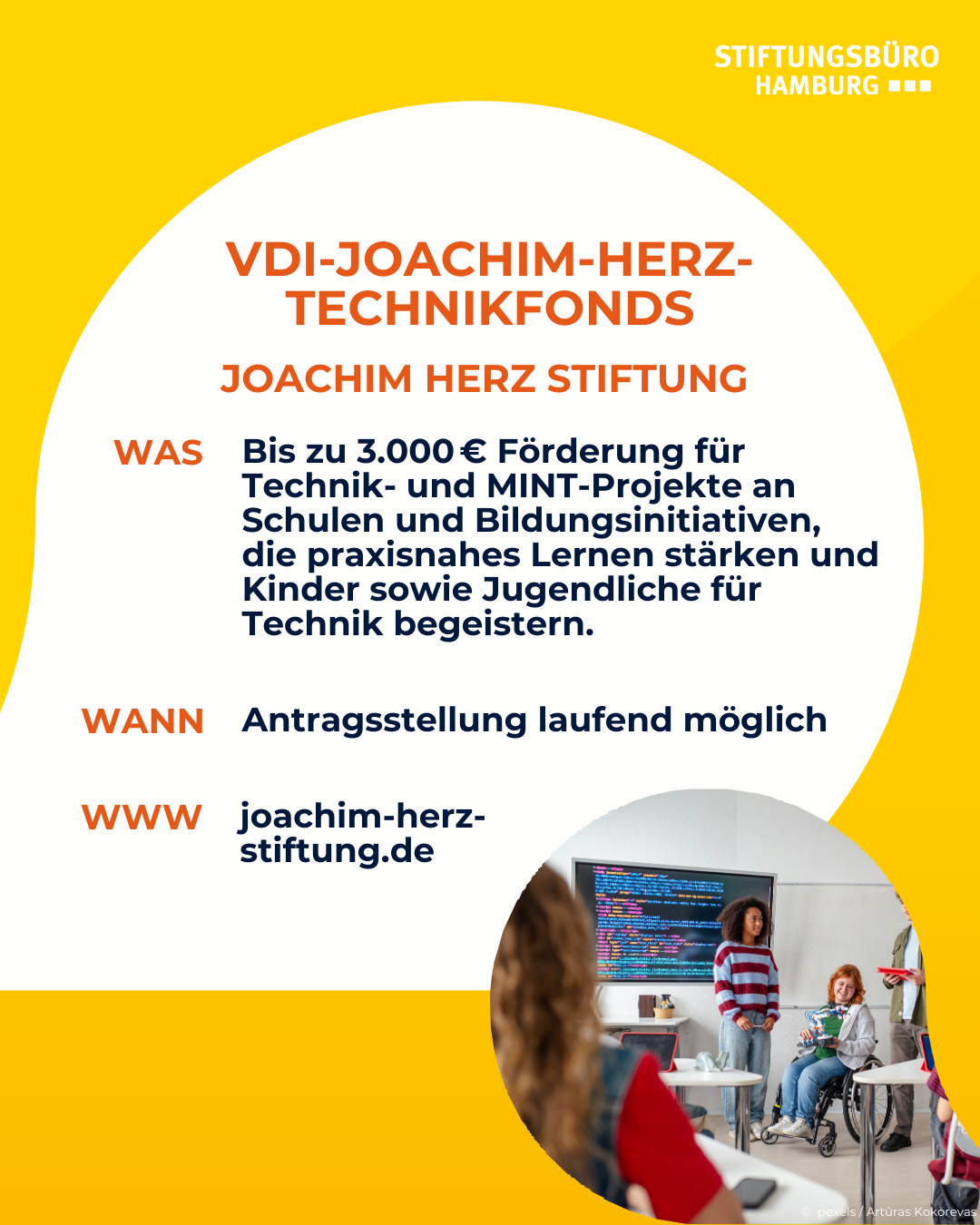 Der VDI-Joachim-Herz-Technikfonds der Joachim Herz Stiftung unterstützt bundesweit allgemeinbildende Schulen, Bildungsinitiativen und außerschulische Lernorte, die Technik und MINTProjekte im oder außerhalb des Unterrichts durchführen möchten. Ob RoboterAGs, 3DDruckWorkshops, aerodynamische Versuche oder experimentelle Lernformate – gefördert werden Vorhaben, die junge Menschen für Technik begeistern und technische Allgemeinbildung stärken.