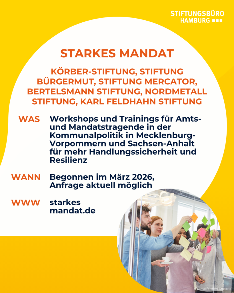 Das Aktionsprogramm „Starkes Mandat“, eine Initiative der Körber-Stiftung, wird von der Stiftung Bürgermut umgesetzt und von der Stiftung Mercator sowie der Bertelsmann Stiftung gefördert. Darüber hinaus unterstützen die Karl Feldhahn Stiftung und die NORDMETALL-Stiftung das Aktionsprogramm.