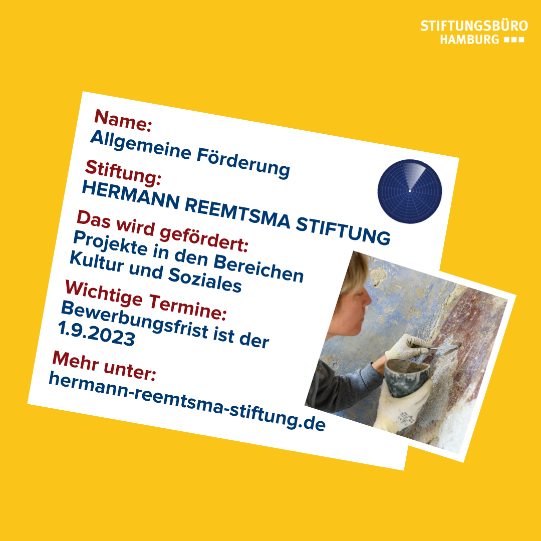 Die HERMANN REEMTSMA STIFTUNG engagiert sich auf den Gebieten Kultur und Soziales in Norddeutschland, Ostdeutschland, vereinzelt in Polen sowie in England. Der Stiftung ist besonders wichtig, dass Bewerber:innen für ihre Projekte „brennen“ und an eine langfristige Wirksamkeit dieser glauben. Jährlich werden 40 bis 50 neue Projekte bewilligt und mit insgesamt zwischen vier und sechs Millionen Euro gefördert. Anträge können von gemeinnützigen und/oder mildtätigen Institutionen gestellt werden. Für eine Befassung im November müssen Anträge vor dem 1. September in der Geschäftsstelle schriftlich eingegangen sein. Weitere Infos zu den Förderkriterien gibt es hier.