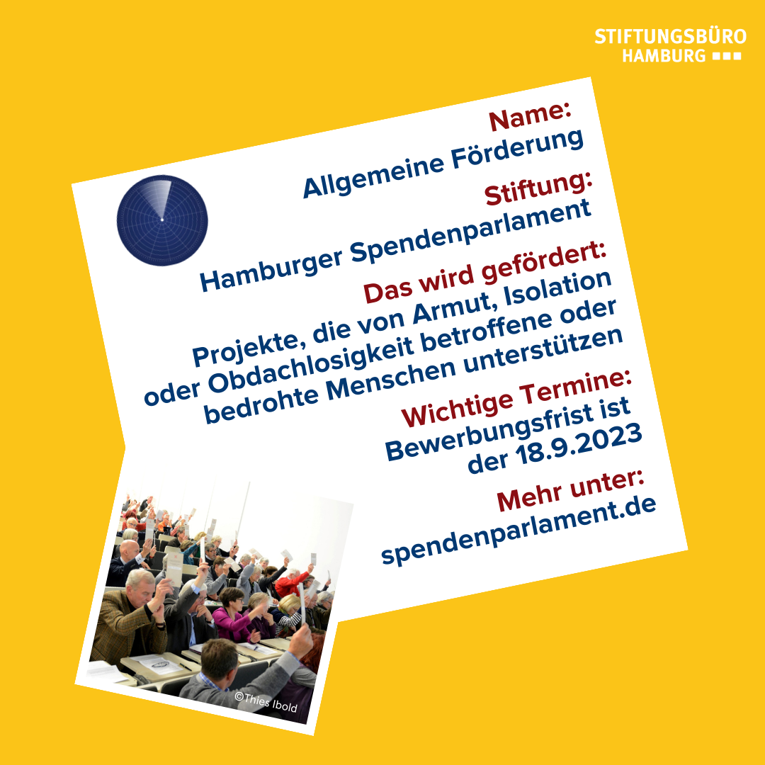 Das Hamburger Spendenparlament wurde 1996 gegründet, um Menschen in Hamburg zu helfen, die in Armut, Obdachlosigkeit und Isolation leben oder davon bedroht sind. Bewerben können sich alle als gemeinnützig oder mildtätig anerkannten Körperschaften, die mit ihren Projekten in diesen Bereichen tätig sind. Jeder Antrag wird dann von einer ehrenamtlichen Finanzkommission begutachtet, bevor er den Mitgliedern des Spendenparlaments mit einer Empfehlung zur Abstimmung gestellt wird. Hier kann jede:r mit einem Jahresbeitrag von mindestens 60 Euro Spendenparlamentarier:in werden und auf drei Parlamentssitzungen pro Jahr über die Verteilung der Mitgliedsbeiträge und weiteren Zuwendungen mitentscheiden. Der Bewerbungsschluss für die 85. Parlamentssitzung ist der 18. September. Alle weiteren Infos zur Antragsstellung und zum Ablauf der Förderung gibt es hier.