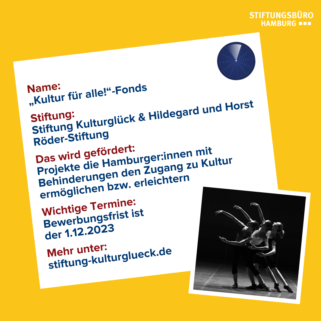 „Kultur für alle!“ heißt der Fonds, den die Stiftung Kulturglück in Kooperation mit der Hildegard und Horst Röder-Stiftung und der Behörde für Kultur und Medien 2022 in Leben gerufen haben. Der Fonds unterstützt mit einer Laufzeit bis 2026 und einem jährlichen Volumen von 70.000€ Projekte, die Hamburger:innen mit einer körperlichen, seelischen oder kognitiven Behinderung, einer Sinnesbeeinträchtigung oder einer demenziellen Erkrankung den Zugang zur Kultur ermöglichen beziehungsweise erleichtern. Die Projekte können von Künstler:innen, Kultureinrichtungen oder auch Initiativen und Einzelpersonen eingereicht werden. Anträge können noch bis zum 1. Dezember gestellt werden.  Alle Informationen zu den Förderkriterien und dem Antragsverfahren gibt es hier.