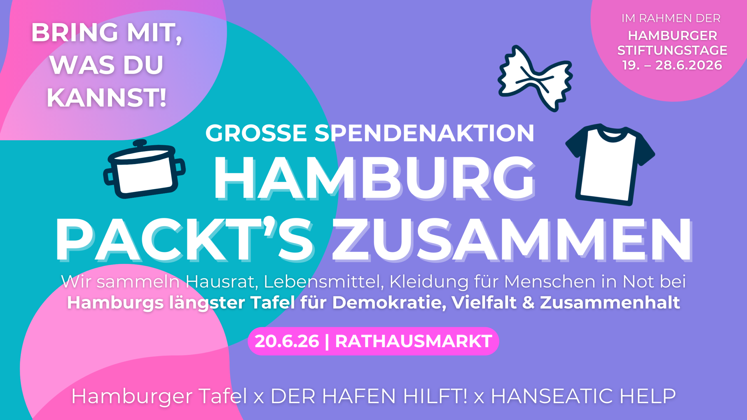 Die Spendenaktion läuft während des Zeitraums der Hamburger Stiftungstage vom 19. bis 28. Juni 2026. In dieser Zeit können Hamburger:innen Sachspenden bei den Spendenpartner:innen abgeben – insbesondere natürlich bei unserer längsten Tafel am 20. Juni auf dem Rathausmarkt.