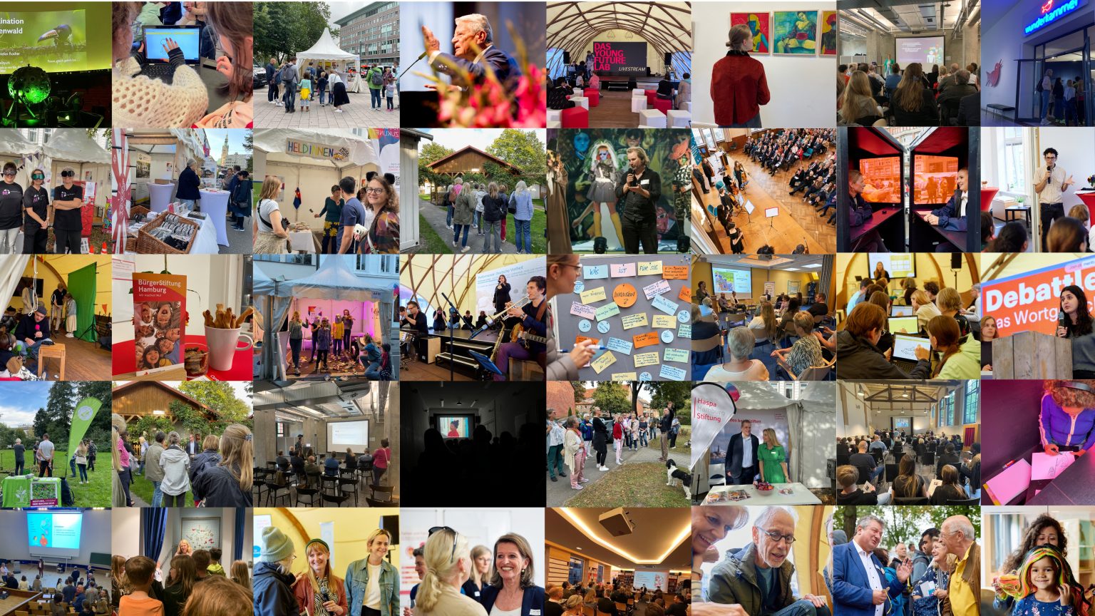 Im Herzen von Hamburg zeigen über 40 Stiftungen auf den Ausstellungs- und Aktionsflächen beim Bürgerfest in Hamburgs Innenstadt, wie Engagement für das Gemeinwohl gelingt und wo Engagement gefragt ist. Außerdem stellen sie im Rahmen des „Young Future Labs“ die junge Generation und ihren Blick auf die Zukunft in den Mittelpunkt. In einem besonderen Bühnen- und Workshopprogramm entwerfen Stiftungen mit jungen Hamburger:innen Perspektiven für Morgen und stellen diese zur Diskussion.